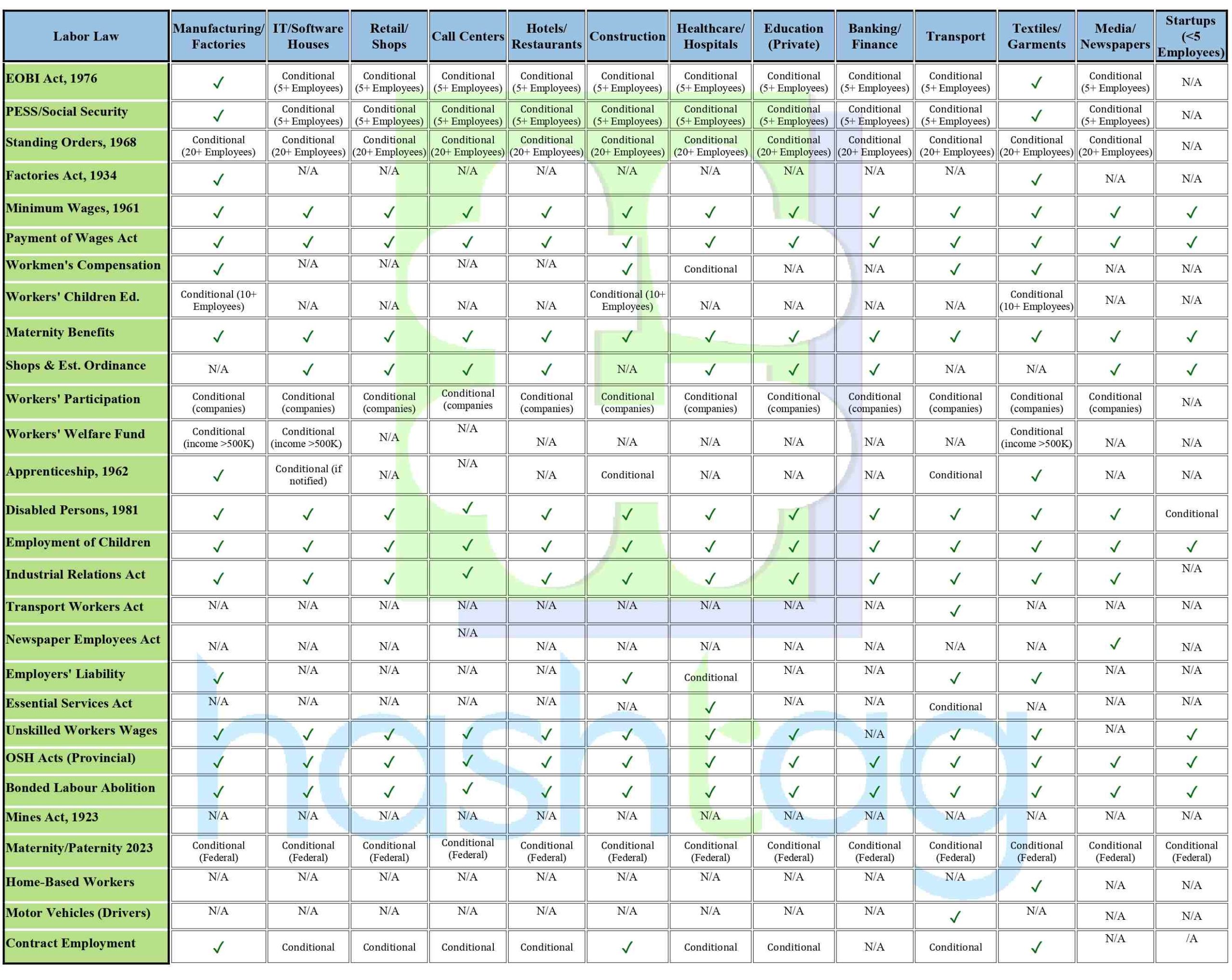 This comprehensive matrix shows which labor laws apply to different industries and sectors in Pakistan.